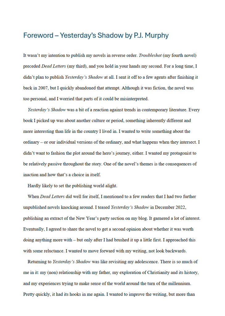But what does “write what you know” mean in practice? I’ll get to that in a second, but firstly, just a clarification. Although Yesterday’s Shadow was my third published novel, I actually wrote it well before the other two, right after finishing a dystopian murder mystery (I was definitely not writing what I knew there), which to date remains on a dusty hard drive. As such, it’s a work of a young author finding his voice and trying to follow all the bits of advice we writers have thrust at us. You can read more about its genesis in this Foreword to the novel I wrote back in 2023.